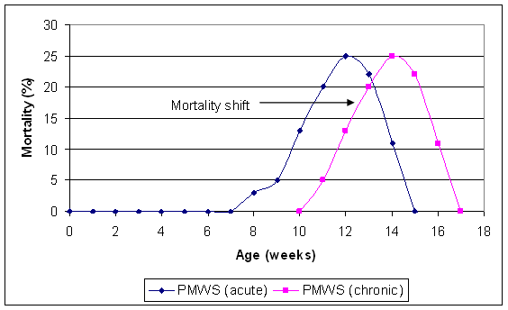 Graph: Mortality of pigs by Age due to PMWS