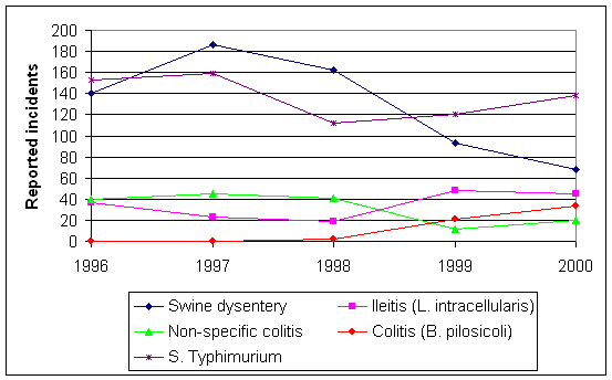 There has been a decrease in the number of incidents involving swine dysentery and non-specific colitis, the latter, probably due to improved diagnosis and recognition of B. pilosicoli, which has increased as well as ileitis. S. Typhimurium has been quite stable even though the number of pigs slaughtered in the UK has fallen by 22% over the same time scale. It is probably due to its association with PMWS. It also has to be remembered that the incidents reported are usually the more severe cases, such as swine dysentery and salmonella cases have to be reported. It does indicate a useful trend however.