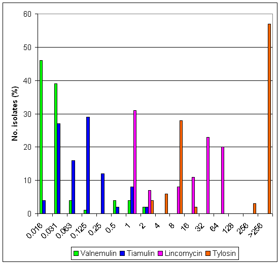 A variety of products are available to prevent and control these infections. Tiamulin, valnemulin, lincomycin and tylosin are all used for controlling the Brachyspira and Lawsonia infections. A recent review showed there is some marked variation in the relative sensitivity of 76 isolates of B. hyodysenteriae to these antibiotics, with valnemulin being the most active followed by tiamulin, lincomycin and tylosin, the latter two showing clear signs of resistance development. The percentage of isolates with the same minimum inhibitory concentration (MIC) to each antibiotic are presented in Graph 2. A low figure means the antibiotic is more active, a high figure i.e. above 2 µg/ml for tiamulin and valnemulin, 32µg/ml for lincomycin and 50µg/ml for tylosin indicates likely resistance.