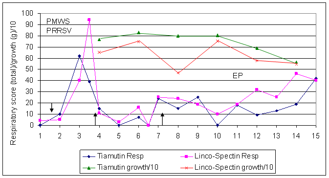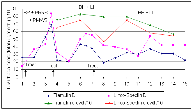 The strategic applications of therapeutic medications were generally effective in controlling mixed enteric and respiratory infections commonly encountered in the field. Tiamutin showed a noticeably improved response with regard to dysentery and ileitis treatment in comparison with Linco-Spectin (week 8) and overall showed production improvements, which economically gave an additional 2.25 margin/pig and 37.4% ROI. A metaphylactic treatment approach to control, with tiamulin given in the drinking water on shed entry, has since been adopted.