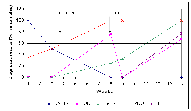 The results are summarised in Table 1. There were three waves of disease. The first was associated with BP and PRRSV in the first few weeks and the treatments were given at week 3 and the pigs recovered promptly (see Graphs 1, 2 & 3). This also coincided with an increase in mortality and hospitalisations primarily associated with PMWS (see Graph 4). There was a second disease wave at week 7 when there was clinical dysentery and PCR positives for BH and LI. Treatment was given in week 8 and a rapid response was noted, especially in the tiamulin-treated pigs and samples were PCR negative. There was an increase in coughing and diarrhoea from week 11, BH and LI were demonstrated in faeces again and sero-conversion to LI and MHP were increasing. Significant EP and APP lesions were recorded at slaughter. Salmonella spp were not isolated and SIV was not found serologically.