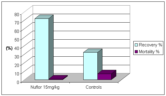 In a series of field trials with mixed pneumonias (See table 1) Nuflor, given at 15mg/kg (1ml/20kg bodyweight) twice at 48 hours intervals, reduced the mortality of pigs dramatically from 7% to 0.7% and had a 72% recovery rate in comparison with control pigs that were severely affected.