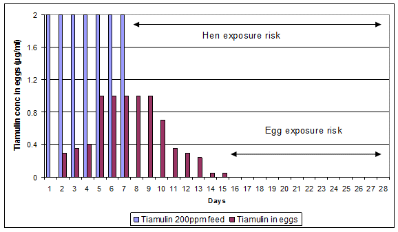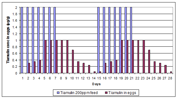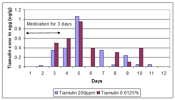 Hen medication: Tiamulin-like activity (tiamulin and microbiologically active metabolites) was shown to accumulate and persist in egg tissues following medication both in feed at 200ppm and in water at 0.0125% (both of which give an approximate dose of 12.5mg/kg bodyweight) (see Figure 4) for several days after treatment (Laber, 1987), using a microbiological assay.